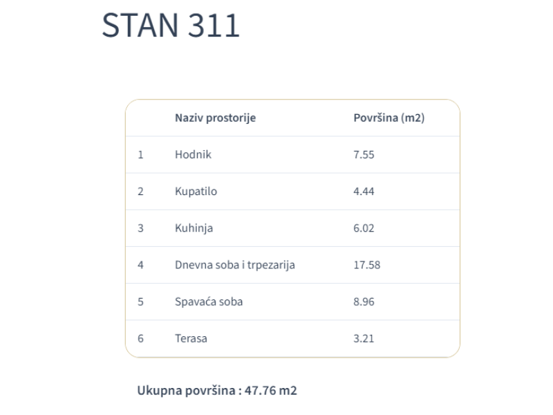 U prodaji je jednosoban stan od 47,76 m² u modernom stambenom kompleksu Golden View VML u izgradnji u Velikom Mokrom Lugu.Stan broj 311 nalazi se na 3. povučenom spratu, idealnom za one koji žele mir, svetlost i osećaj privatnosti.